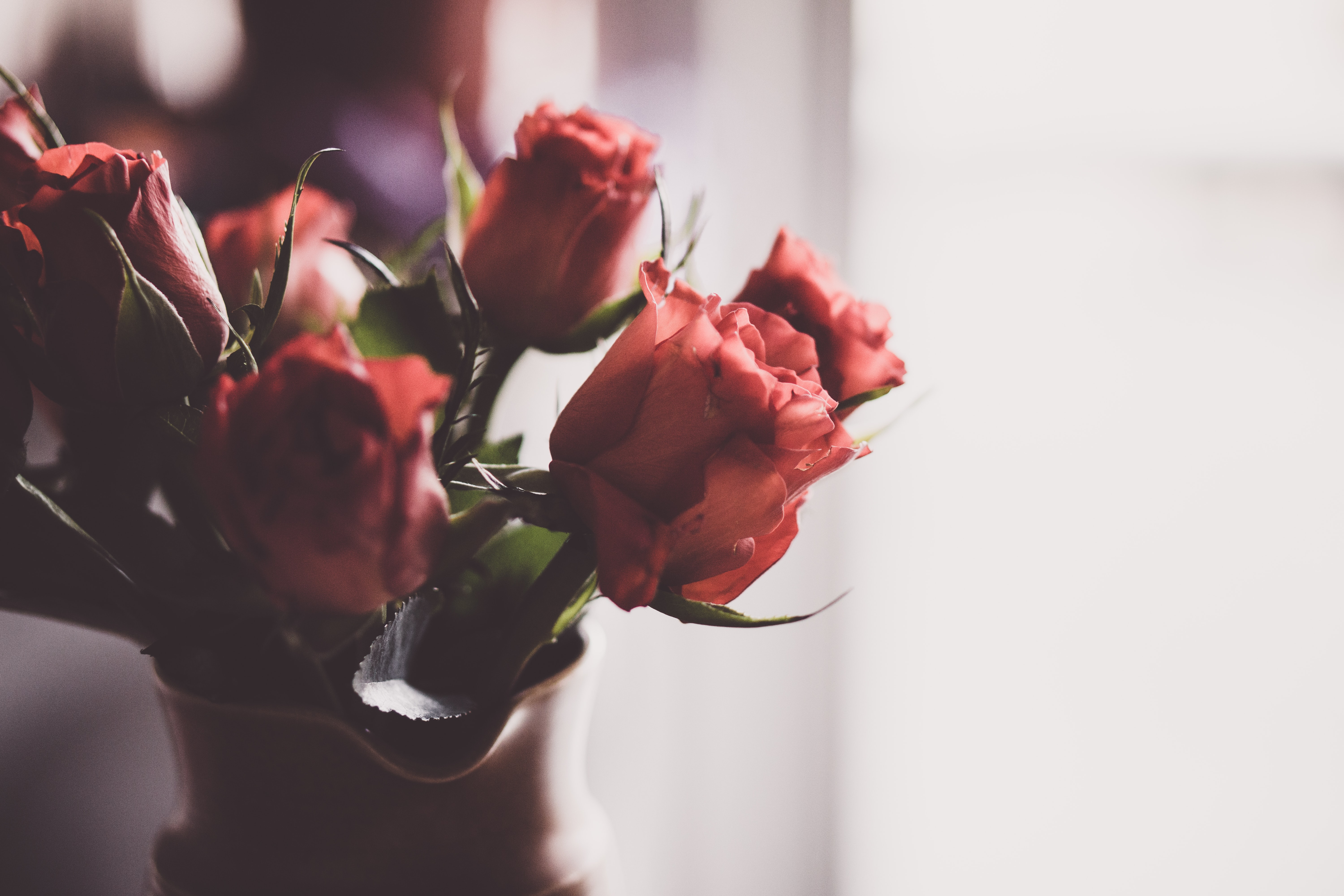 Růže jsou svým vlastním pánem. Nikdy se jich nedotýkejte. Květy růží jsou velmi jemné a okamžitě reagují na tlak. Když jim měníte vodu, vyjměte je opatrně z vázy a položte na kuchyňskou utěrku nebo nějaký jemný hadřík.
