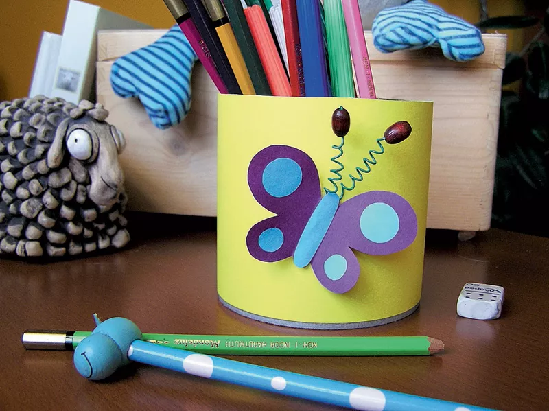 Jak na to: Dózu polepte pomocí oboustranné lepicí pásky barevným papírem. Předkreslete si tvar motýla, jeho těla a koleček na křídla. Vše vystřihněte a přilepte k sobě. Na špejli namotejte kousek drátku. Na jeden konec nasaďte korálek a přesahující část zahněte dovnitř. Stejným způsobem vytvořte i druhé tykadlo a nalepte je na dózu. Hotového motýla opatrně nalepte pod tykadla.