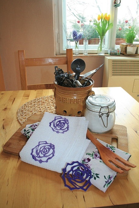 Potřebujete: pěnovku (moosgummi), odlamovací nožík nebo skalpel, barvu na textil (např. značky Kokolo), utěrku nebo něco jiného, co budete chtít dekorovat