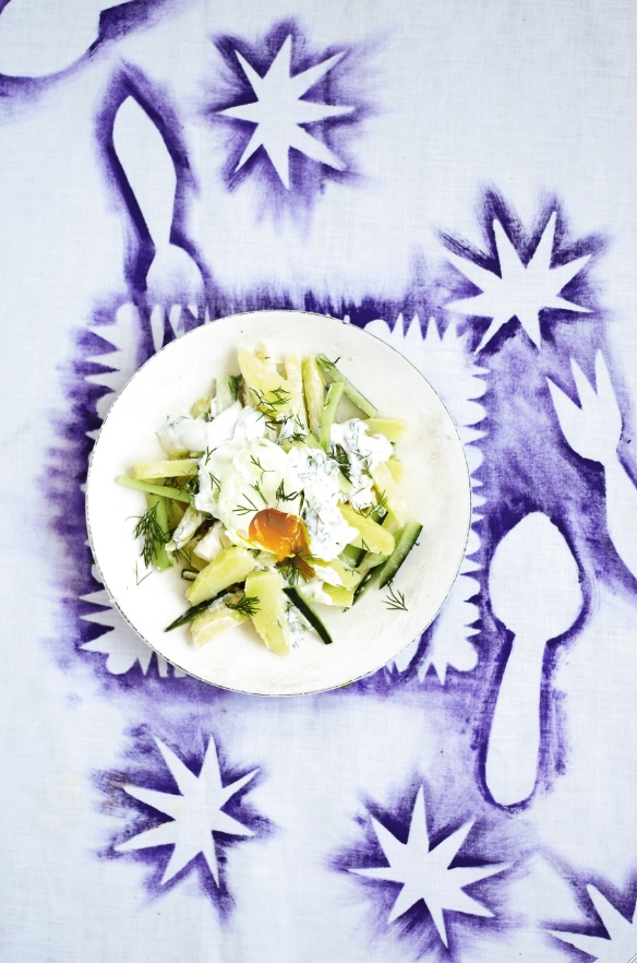 Pro 4 osoby potřebujeme: 600 g brambor, 1 salátovou okurku, 2 lžíce olivového oleje, 1 stroužek česneku, 200 g zakysané smetany, 1 lžíci citronové šťávy, 4 vejce, čerstvě mletý pepř, sůl