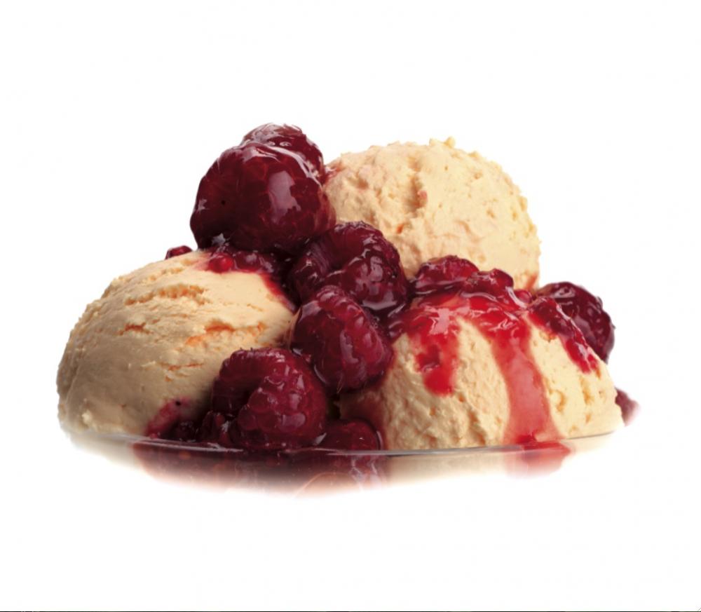 Na pánvi rozpustíme máslo, do něhož nasypeme cukr, který za stálého míchání necháme ztmavnout. Potom přidáme maliny pokapané citronovou šťávou, zamícháme a krátce prohřejeme. Do připravených misek naservírujeme kopečky vanilkové zmrzliny, přelijeme horkou směsí a ihned podáváme.