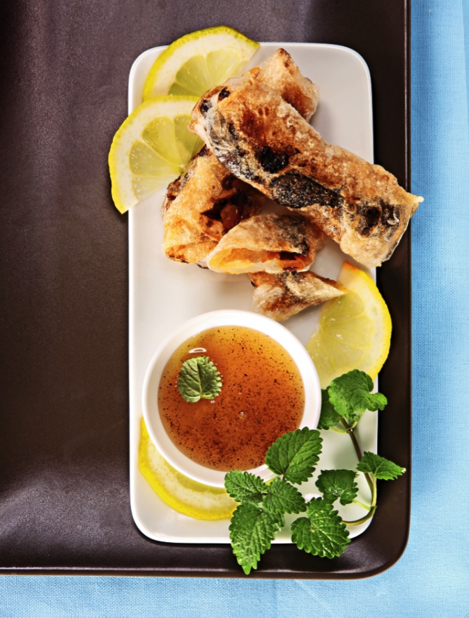 Pro 4 osoby potřebujeme: 200 g míchaného sušeného ovoce (meruňky, švestky, hrušky, jablka), 8 kulatých plátů rýžového papíru, olej na smažení