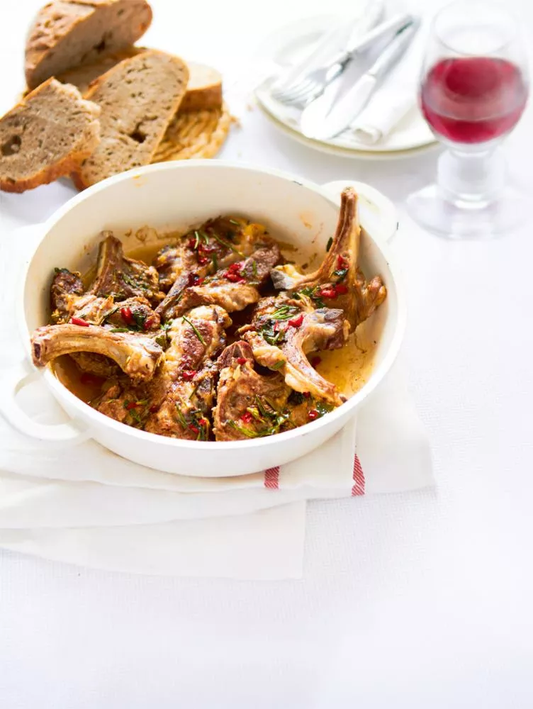 Pro 4 osoby potřebujeme: 8 jehněčích kotlet, 2 stroužky česneku, 4 lžíce olivového oleje, 2 lžíce octa balsamico, 100 ml bílého vína, 1 chilli papričku, 1 lžíci másla, 1 lžíci hladké mouky, 2 snítky rozmarýnu, čerstvě namletý pepř, sůl