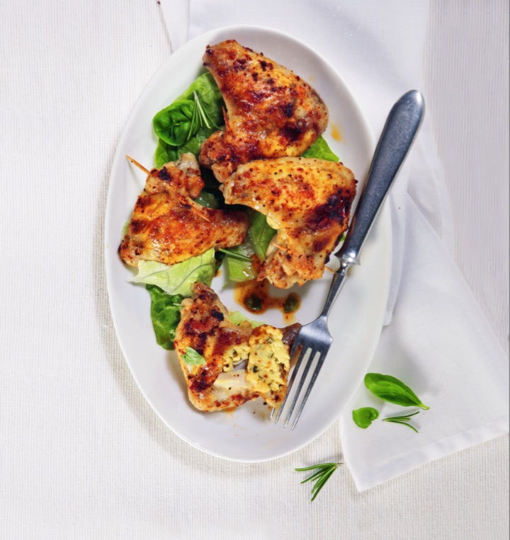 Na nádivku: 2 žloutky, 200 g lučiny, 3 utřené stroužky česneku,120 g najemno nastrouhaného tvrdého sýra (parmazán nebo pecorino), 2 větvičky bazalky, 1 větvičku oregana, 4 větvičky petrželky, drůbeží vývar na šťávu, 50 g másla, drcený pepř, sůl