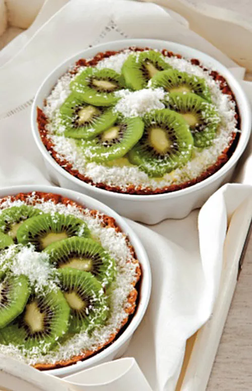 Pudink uvaříme, vmícháme kokos a cukr a krémem naplníme předpečené korpusy do 2/3. Necháme v lednici ztuhnout. Želé se sirupem a cukrem připravíme podle návodu, korpusy ozdobíme plátky kiwi a zalijeme dortovým želé. Střed a okraje posypeme kokosem a koláčky dáme vychladit.