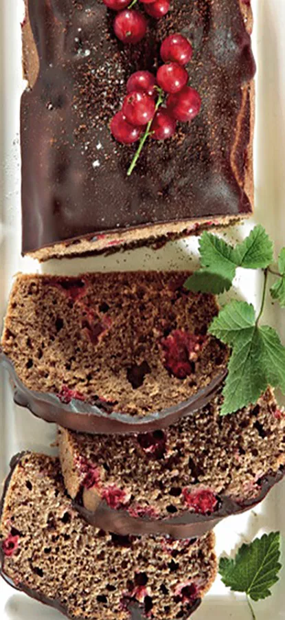 2 hrnky polohrubé mouky, ½ hrnku hladké mouky, ¾ hrnku pískového cukru, 1 sáček kypřicího prášku do perníku, 1 lžička kypřicího prášku do pečiva, 2 lžíce prosátého kakaa, 1 hrnek mléka nebo černé kávy, 2 menší vejce, ¼ hrnku oleje, 1 lžíce rybízové marmelády, 1 hrnek čerstvého nebo mraženého bobulového ovoce (nejlépe červeného rybízu), ¾ hrnku čokoládové polevy, tuk a hrubá mouka na vymazání a vysypání formy
