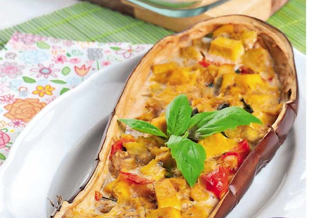 3. Směs ihned přendáme do vydlabaných lilků a dáme zapéct do trouby. Pečeme přibližně 30 minut.