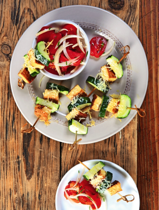 Pro 4 osoby potřebujeme: 2 mladé malé cukety, 300 g marinovaného sýra tofu, 40 g nastrouhaného parmazánu