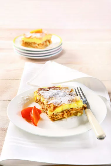 Suroviny: 450 g listového těsta, hladká mouka na rozválení těsta, máslo na potření, 1 balíček kulatých piškotů, 1 kg jablek, 150 g cukru, trocha skořice, 100 g mletých vlašských ořechů, 1 l plnotučného mléka, 3 sáčky vanilkového cukru, 2 sáčky vanilkového pudinkového prášku, cukr moučka na posypání