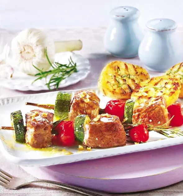 Špízy jsou skvělé v tom, že je vždy můžete obměnit a vykouzlit tak pokaždé jinou dobrotu. K vepřovému masu a zelenině se skvěle hodí opečené brambory, které navíc můžete potřít česnekem a zázvorem, a dodat jim tak správný říz!