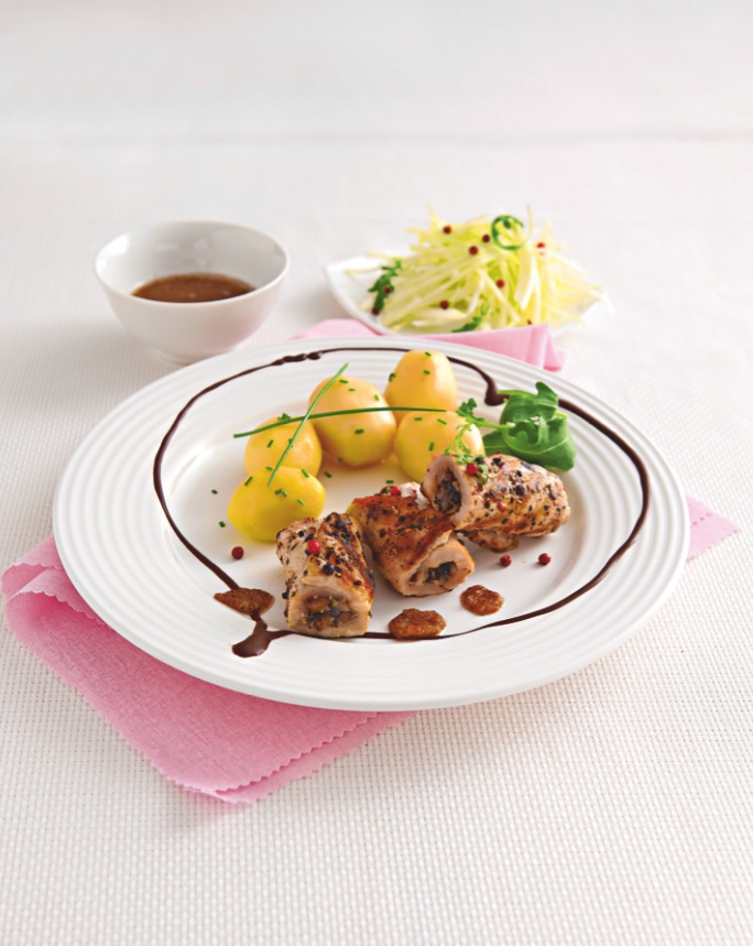 Maso osolíme a opepříme a restujeme na oleji ze všech stran. Pak maso přendáme do pekáčku, podlijeme výpekem a asi 25 minut pečeme při teplotě 210 °C. Brambory uvaříme ve slané vodě, scedíme a orestujeme na másle, posypeme solí a kořením. Na přeliv necháme zkaramelizovat cukr, přidáme máslo a ořechy, promícháme a podáváme.