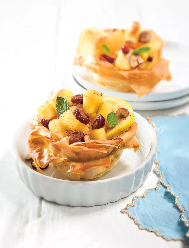 1. Každý plat rozkrojte na 4 čtverce, ty naskládejte cikcak přes sebe a každou vrstvu potřete trochou másla. Těstem vyložte máslem vytřené 4 hlubší zapékací mističky a v troubě při 180 °C zapékejte asi 8 minut dorůžova.