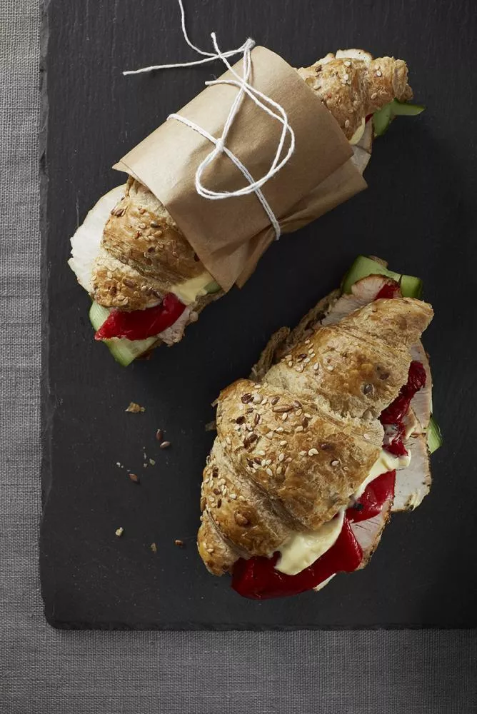 Na 4 porce: 4 celozrnné croissanty, 4 ks pečené a nakládané papriky ve sladkokyselém nálevu, 16 plátků krůtí pečeně či šunky, plátky salátové okurky, 4 lžíce Hellmann’s Majonézy Originál