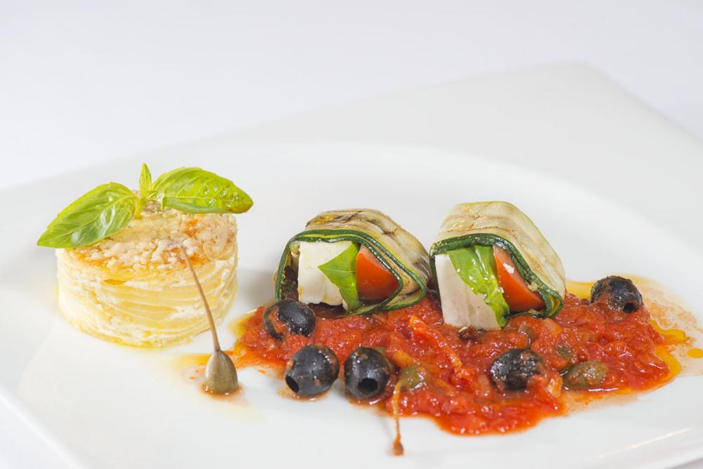 1. Na mřížkové grilovací pánvi ogrilujte cuketu nakrájenou podélně na cca 2 mm silné plátky. Položte na ni plátek čerstvého rajčete, lehce osolte a opepřete. Dále přiložte marinovanou fetu, kousek sušeného rajčete, list bazalky a udělejte závitky. Cca po dobu 7 minut dopečte na pánvi.