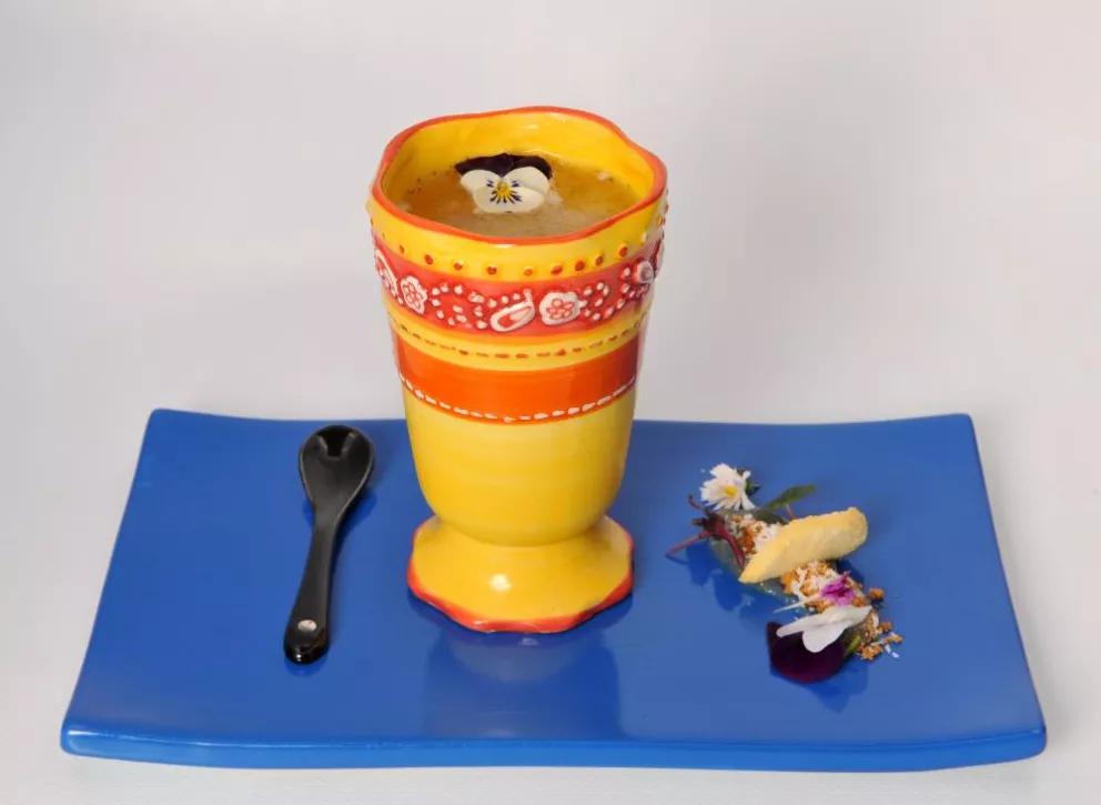 Do šejkru vložíme kokosový olej a čaj a rozmačkáme, aby se obě ingredience dobře spojily. Přidáme džusy a pyré, zasypeme ledem a pečlivě promícháme. Směs přecedíme do sklenice, dolijeme Mattoni perlivou, ozdobíme fialkou, zastříkneme parfémem z kokosu a citrusů. Podáváme se sušenou broskví, jedlým pískem, hruškovou marmeládou, řeřichou a jedlými květy.