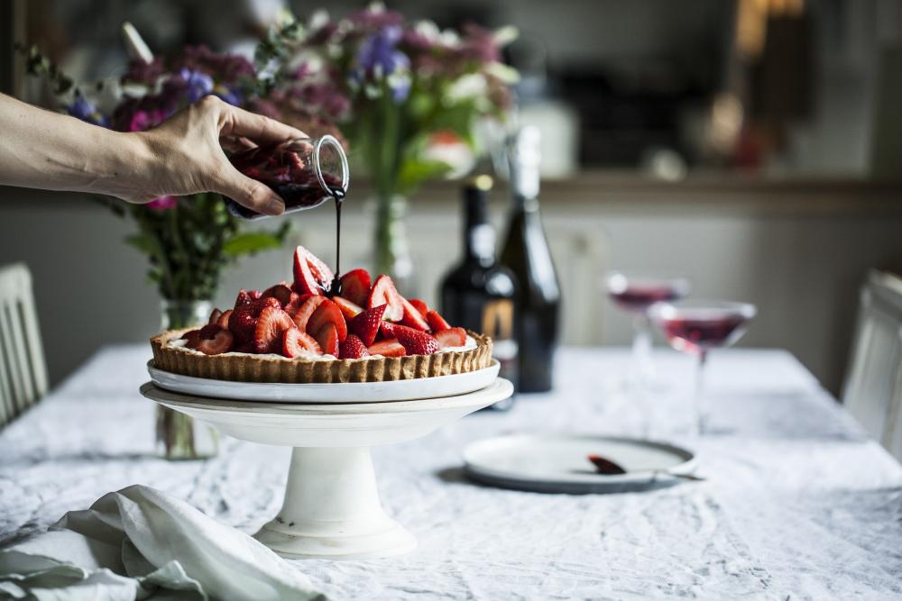 5. Na závěr už jen zbývá naplnit korpus krémem, ozdobit jahodami a jako gurmánskou tečku doplnit o sirup z portského vína. Korpus je dobré plnit až těsně před servírováním, protože tartaletka je nejchutnější, když její korpus lehce křupne, jahody jsou čerstvé a právě polité portským sirupem.